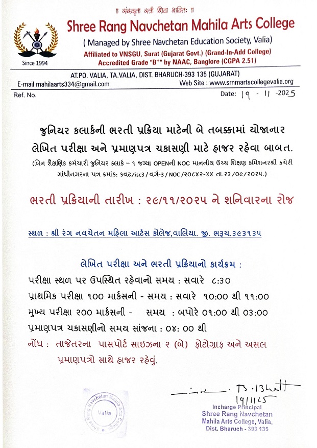 જુનિયર ક્લાર્કની ભરતીની પ્રક્રિયા માટેની બે તબક્કામાં યોજાનાર લેખિત પરીક્ષા અને ભરતી પ્રક્રિયા.